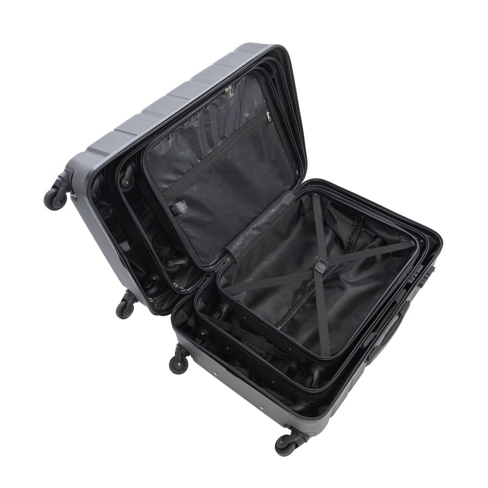 A set of suitcases made of hard, scratch-resistant material – ABS. The model has a numerical lock . The suitcases are equipped with single wheels with a rotation range of 360°. Thanks to two rubber handles and a pull-out handle, it is possible to transport them comfortably. Inside, the suitcases are divided into two compartments. One of the parts closed with a fabric zipper, has a practical mesh pocket, the other part with elastic straps to protect luggage from displacement. The set of suitcases consists of suitcases in sizes: 19’‘/24’‘/28’‘.